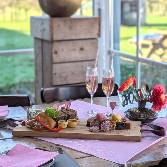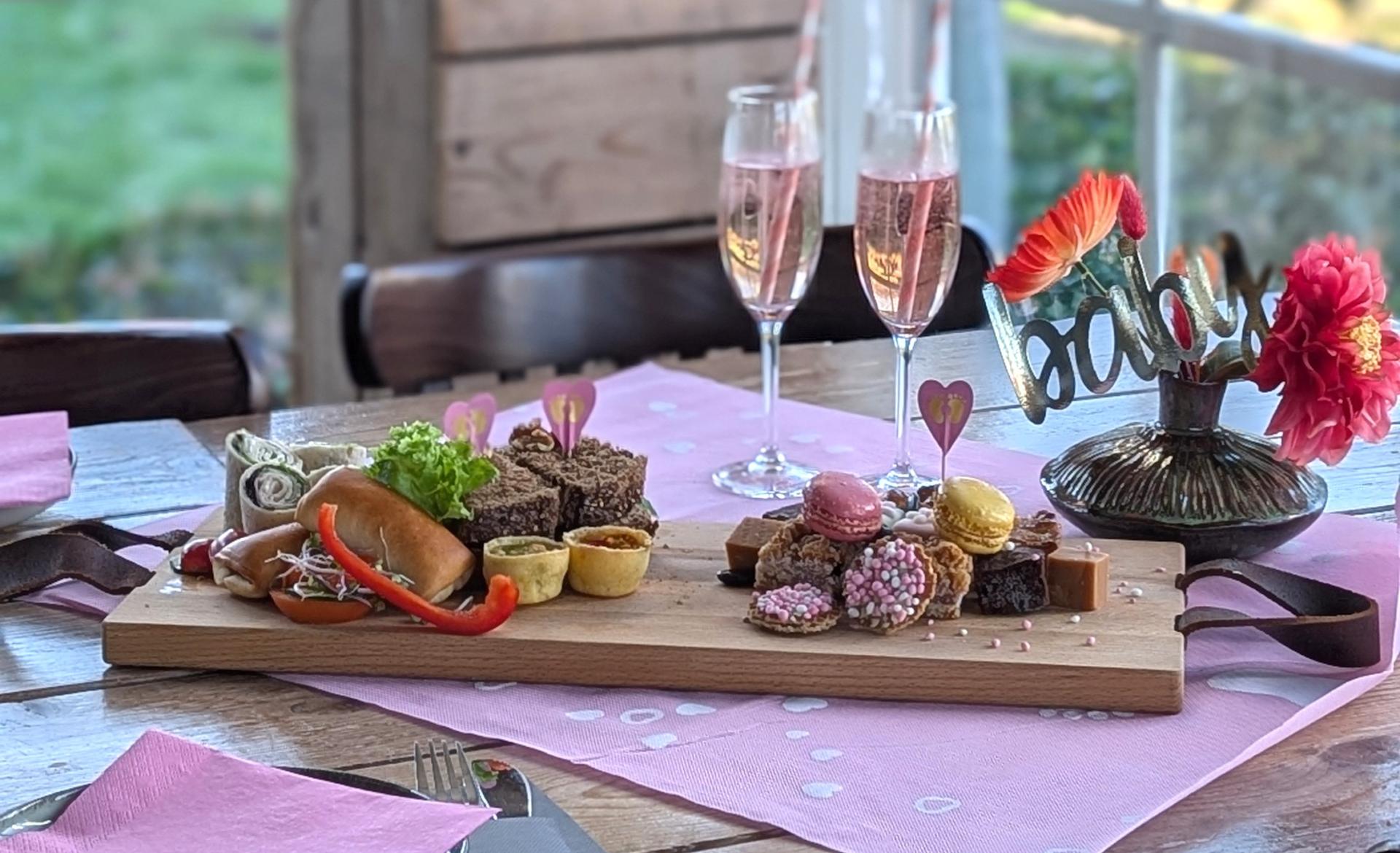 Dan maken wij een heerlijke High Tea zwangerschaps-proof voor jullie. Je start met een feestelijk bubbeltje ( Natuurlijk alcohol vrij) en daarna kunnen jullie gaan genieten van een feestelijke High Tea. Met een compleet versierde tafel.
